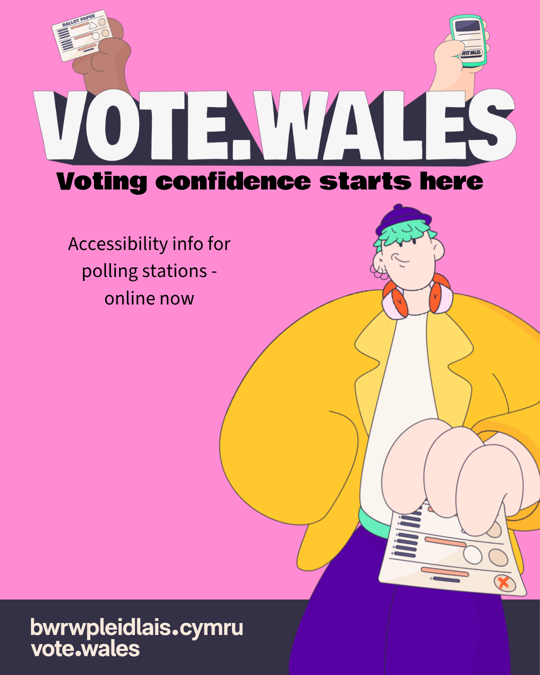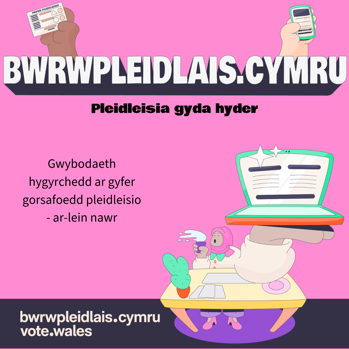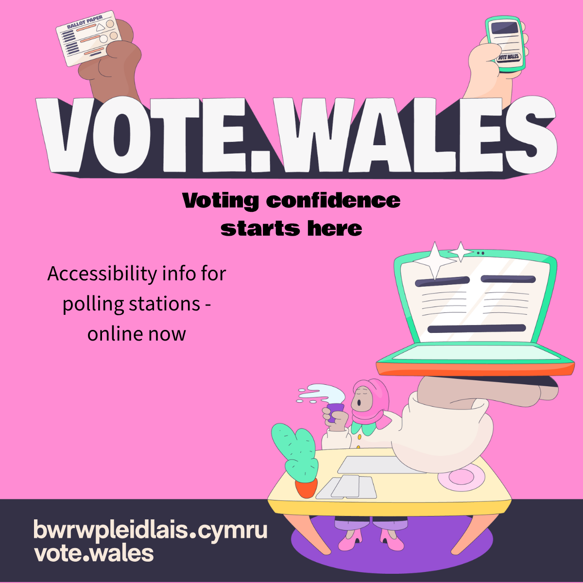 - Cer i bwrwpleidlais.cymru a pleidleisia gyda hyder. / Go to vote.wales. Voting confidence starts here.